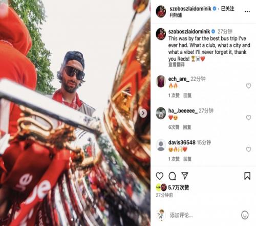 索博社交媒体写道:这是我迄今为止经历过最棒的巴士之旅。何等的俱乐部,何等的城市,何等的氛围!永生难忘,感谢红军!